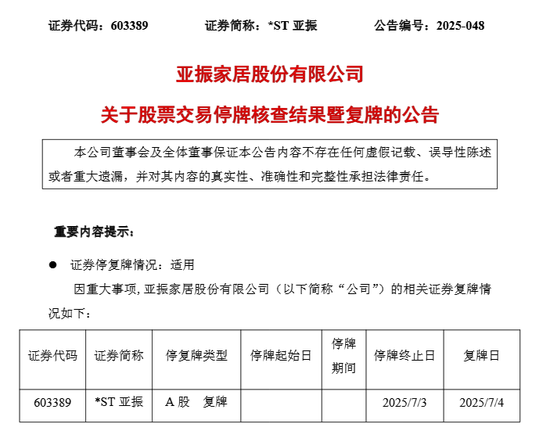 7月3日晚间,*ST亚振(603389)发布公告称,公司股票核查工作已完成,将于7月4日复牌。